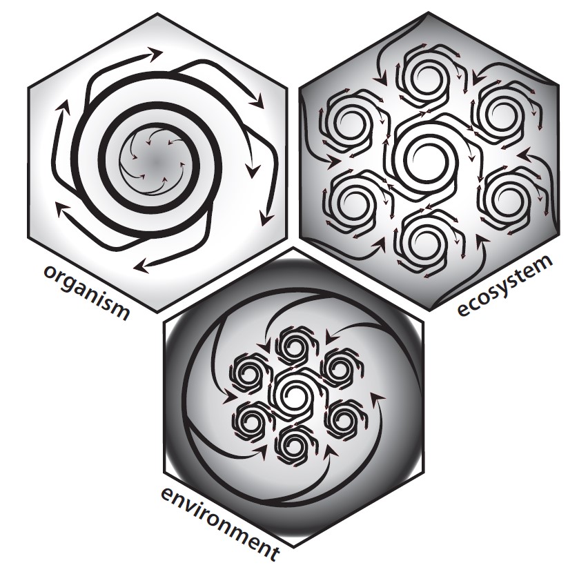 Ecosystemic art by Sarah McManus, inspired by our hyperset equation for Life, which we discussed at a science conference – scroll down to see hexaflexagons of Life: